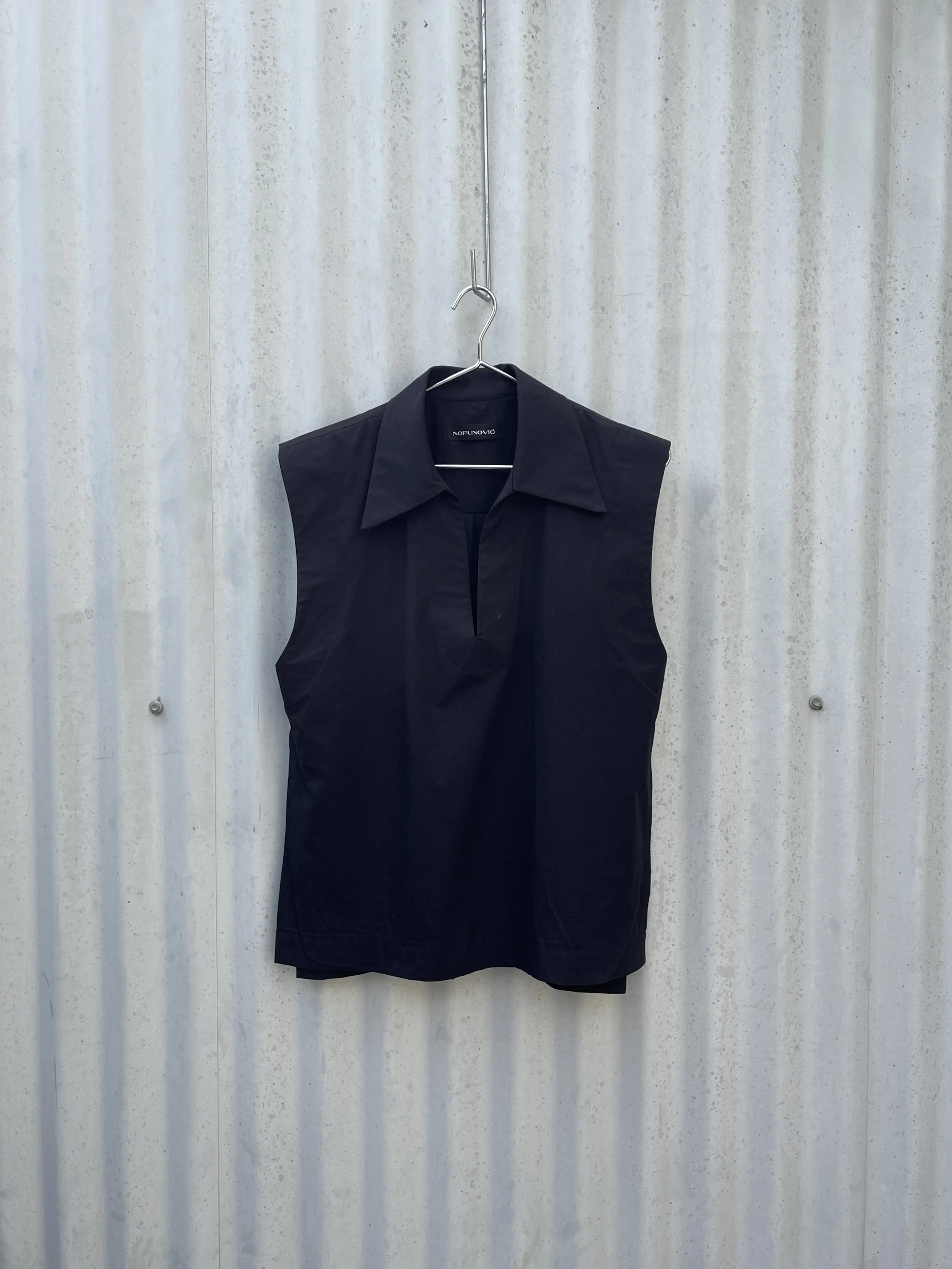 The Vakho Tank reimagines a classic shirt as a sleeveless style. Featuring a narrow v-neck, one-piece collar, stepped hem with side splits and a back box pleat into a yoke. This is an unlined style with structured armhole and neckline facings.